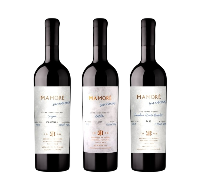 • Três garrafas de vinho tinto Mamoré com rótulos brancos e textos em azul e dourado