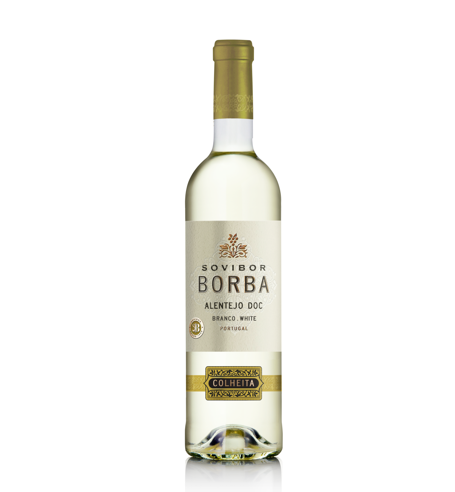 • Garrafa de vinho branco Sovibor Borba Alentejo DOC com rótulo creme e cápsula dourada