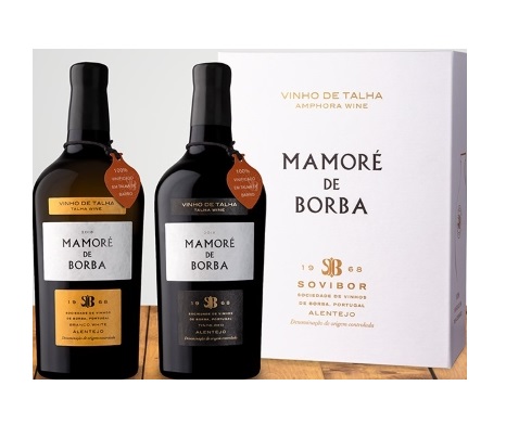 • Duas garrafas escuras de vinho Mamoré de Borba com caixa branca ao fundo