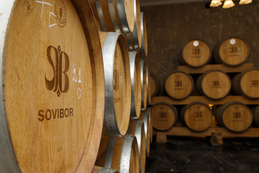 • Barril de madeira com inscrições SOVIBOR e SB dentro de adega com vários barris empilhados